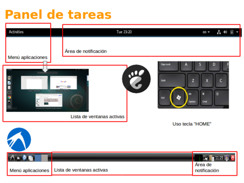 Independientemente del entorno gráfico usado, el panel de tareas divide en tres partes principales: Menú de aplicaciones, Lista de ventanas activas y Área de notificación.