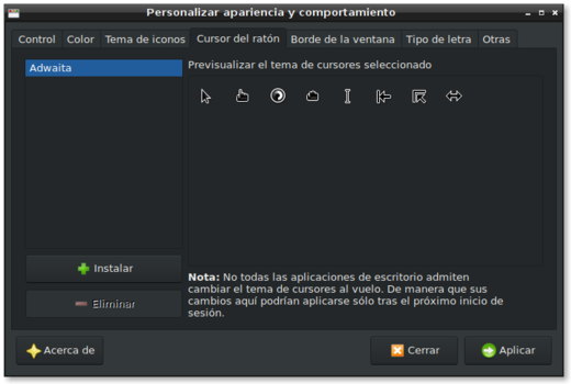 En la pestaña Cursor del ratón nos da la opción de elegir iconos que trae por defecto o de instalar nuevos que nos descarguemos de la web.