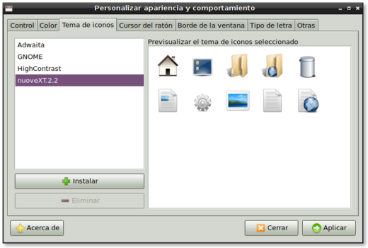 La estética de los iconos la podemos cambiar desde la pestaña Tema de iconos. Además también da la posibilidad de instalar nuevos temas desde la web.