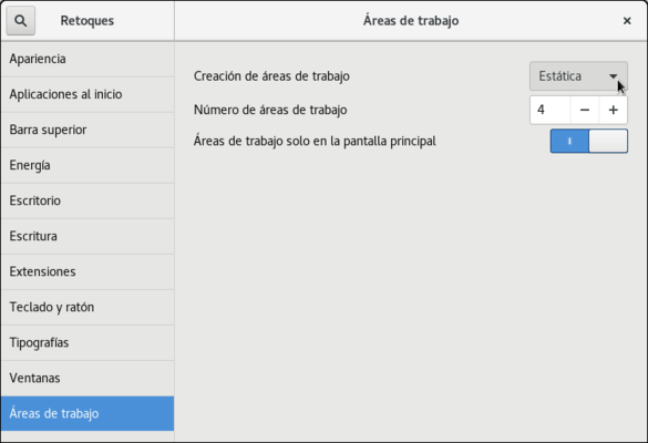 Aquí podemos marcar un numero de escritorios fijos a través de la opción "Creación de áreas de trabajo --> Estática" y marcar si queremos visualizar los iconos