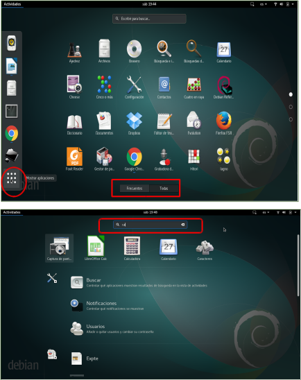 Se puede acceder al menú de aplicaciones de 2 formas distintas: (1) Desde el botón "mostrar aplicaciones" en el panel lateral. Nos mostrará la lista de todas la aplicaciones instaladas. Además abajo del todo aparecen dos botones donde podemos ver las "frecuentes" o "todas". (2) Desde el buscador que se encuentra en el escritorio, basta con el escribir el nombre la aplicación y nos muestra el listado de programas que contiene ese nombre.