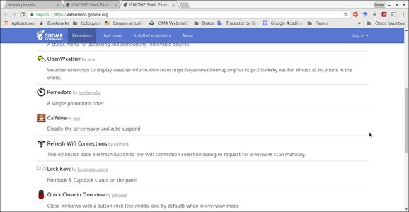 GNOME extensions manager proveé algunas funcionalidades adicionales al entorno de escritorio. Para instalarlo, ejecutamos el siguiente comando en la terminal: