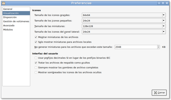 Además desde el menú ARCHIVO/PREFERENCIAS se pueden configurar otras opciones relacionadas con el comportamiento, la visualización, la disposición o la gestión de volúmenes extraibles.