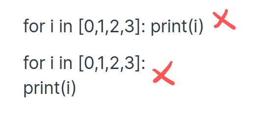 ; - Cuando se usa un comando como un for, if, while etc. la línea llamando a este comando se termina por : y los comandos utilizados adentro de esta condición se definen en un bloque de nivel más alto, para que quede más claro esta noción de bloque siguen dos ejemplos :