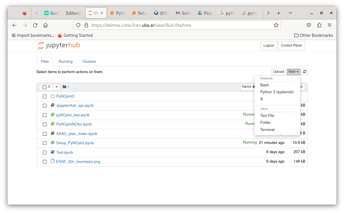 Por el momento, están activados los notebooks de 'python', 'R' y 'shell'. Cada tipo de `notebook' se selecciona en el menú desplegable llamado new (arriba a la derecha, ver imagen).