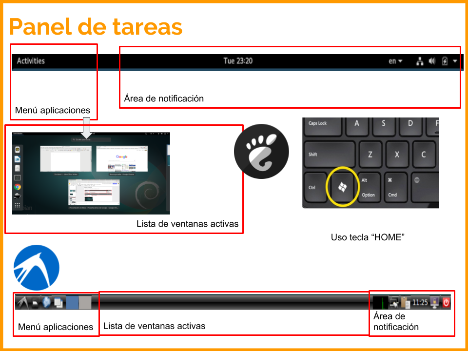 Independientemente del entorno grafico usado, el Escritorio se divide en tres partes principales: Menú de aplicaciones, Lista de ventanas activas y Área de notificación.