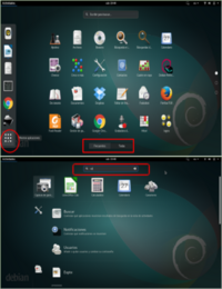 Se puede acceder al menú de aplicaciones de 2 formas distintas: (1) Desde el botón "mostrar aplicaciones" en el panel lateral drch. Nos mostrará la lista de todas la aplicaciones instaladas. Además abajo del todo aparecen dos botones donde podemos ver las "frecuentes" o "todas". (2) Desde el buscador que se encuentra en el escritorio, basta con el escribir el nombre la aplicación y nos muestra el listado de programas que contiene ese nombre.