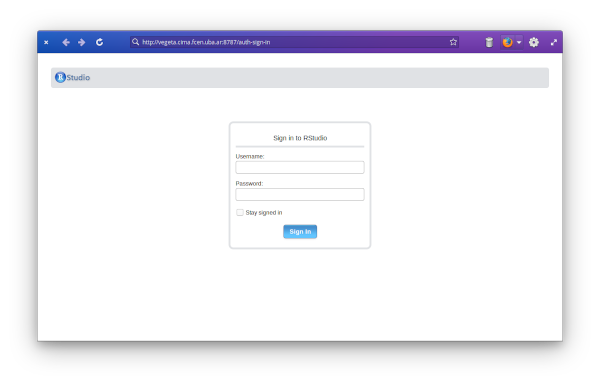 Si tu computadora está conectada a la red del CIMA, lo único que tenés que hacer es ir a un explorador e ir a la dirección SERVIDOR:8787. Donde SERVIDOR es la dirección del | Si tu computadora está conectada a la red del CIMA, lo único que tenés que hacer es ir a un explorador e ir a la dirección SERVIDOR:8787. Donde SERVIDOR es la dirección del servidor que quieras usar. Esto te va a llevar a la página de login donde tenés que usar tu usuario y contraseña del servidor. En la imágen de abajo, por ejemplo, se muestra la página de login en vegeta.cima.fcen.uba.ar | ||